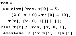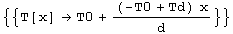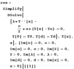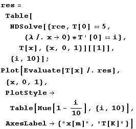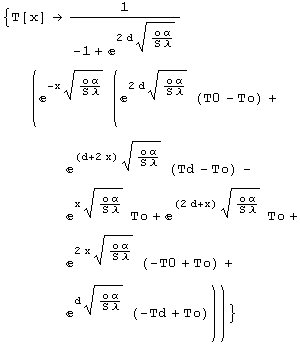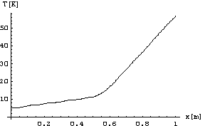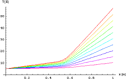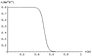 Řešení ustálených 1D tepelných polí.Základem je Fourier Kirchhoffova rovnice Pro stacionární případy obdržíme v 1D rovnici pro l závislé na teplotě a souřadnici. Ukážeme si nějaké základní případy. Začněme nejjednodušším: stěna tloušťky d má tepelnou vodivost l=konst , v x=0 má teplotu T0 a teče jí tepelný tok q [W/(m^2 K)]. Ve stěně teplo nevzniká. Naše rovnice má tvar Cauchyho úloha má v tomto případě fyzikální smysl následující: Řešení obdržíme snadno a rychle: A vidíme lineární závislost teploty na souřadnici. Například pro cihlovou zeď .... Schválně jsme napsali "Cauchyho úloha" a nikoli "okrajová podmínka". F.-K. rovnice je parciální diferenciální rovnice, okrajová podmínka znamená znalost řešení na hranici nějaké oblasti, při redukci na 1D problém je touto oblastí intarval a jeho hranicí dva jeho krajní body. Ovšem pro obyčejné diferenciální rovnice je třeba znát v jednom bodě hodnotu řešení a jeho derivaci a nikoli hodnotu řešení ve dvou různých bodech. V některých případech to nevadí: ndy to vadit bude. Každopádně jde o zajímavý vztah mezi PDR a ODR. Pojďme dále; často se uvádí rovnice uvažující přecházení tepla např. z vodiče do okolí konvekcí; pro plošnou hustotu výkonu platí q=a*(T[x]-Tokoli), dále se uvažuje q*obvod*dx=Qv*průřez*dx; odtud snadno Qv= Na první pohled možná vypadá tento průběh podivně, ale když se nad tím zamyslíte, jak prostupuje teplo vedením třeba drátem a konvekcí do okolí /význam použitých symbolů je doufám jasný/, vidíme, že je to správně. Postupujme dále a vyšetřeme případy s proměnnými látkovými vlastnostmi, zde především tepelnou vodivostí. Styk dvou látek můžeme simulovat rychle probíhajícím spojitým přechodem. Řešení bylo provedeno numericky, jednoduše proto, že výhody analytických řešení již výhodami nejsou-pokud nalezneme řešení v uzavřeném tvaru, je tak komplikované, že z něj "nic nevidíme." Všimněte si také, že jsme opět řešili Cauchyho úlohu a nikoli úlohu okrajovou. Numerické metody řešení okrajových úloh jsou mnohem méně propracované než pro řešení Cauchyho úlohy. Zde se zmíním jen o tzv. metodě střelby. V podstatě řešíme Cauchyho úlohy pro soubor hodnot první derivace na levé hranici; z řešení vybereme to, které má požadovaniou hodnotu na pravé hranici.Při vedení tepla entropie systému stoupá a tento proces je stabilní pro "skoro všechny" materiály. Zobrazení z hodnot derivace (tedy tepelného toku) do teploty na druhé straně zdi je jednoznačné a proto je metoda střelby snadno algoritmizovatelná. Přílohy
