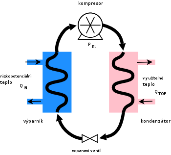 Stlačené kapalné teplonosné médium je převedeno přes expanzní ventil do výparníku, kde mění své skupenství na plyn (páru). Tím se ochladí na nízkou teplotu a přejímá teplo ze svého okolí. Ohřáté plynné médium je dále nasáváno kompresorem a stlačeno v kondenzátoru, čímž se zvýší jeho teplota. Ta je předána v kondenzátoru do okolí a dochází ke zkapalnění teplonosného média. Topný faktorTopný faktor je definován jako poměr mezi získanou tepelnou energií a dodanou elektrickou energií